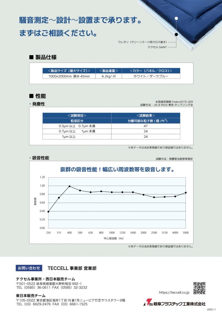 「クリーンクロスウレタン」はクリーンルームで使用できる吸音材です。表面をクリーンスーツ用クロスで覆っているため、安心して使用できます。ウレタンフォームやグラスウールと同様、ハニカム防音パネル「テクセルSAINT」との積層によってさらなる吸音効果を発揮。食品加工、半導体、医療など、クリーンルーム内の環境改善にお勧めです。